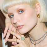 The Bubble Green Aventurine Ring is size adjustable and features a vintage light green gemstone hand faceted to reflect the light. This stunning ring is light around the finger and add a pop of colour to any outfit.