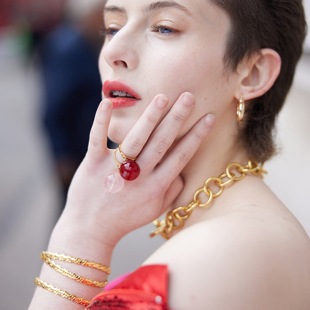 The Bubble Red Onyx Ring features a stunning pre-loved round and faceted gemstone. Handmade with recycled materials this unique ring will add a pop of colour to any outfit.