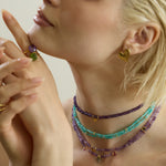 A stunning gemstone beaded necklace is exactly what your wardrobe is missing. The Ines Amethyst Necklace is handmade with vintage amethyst gemstones and a 18k gold vermeil round charm.