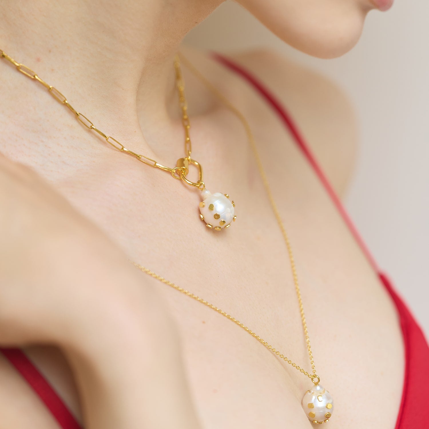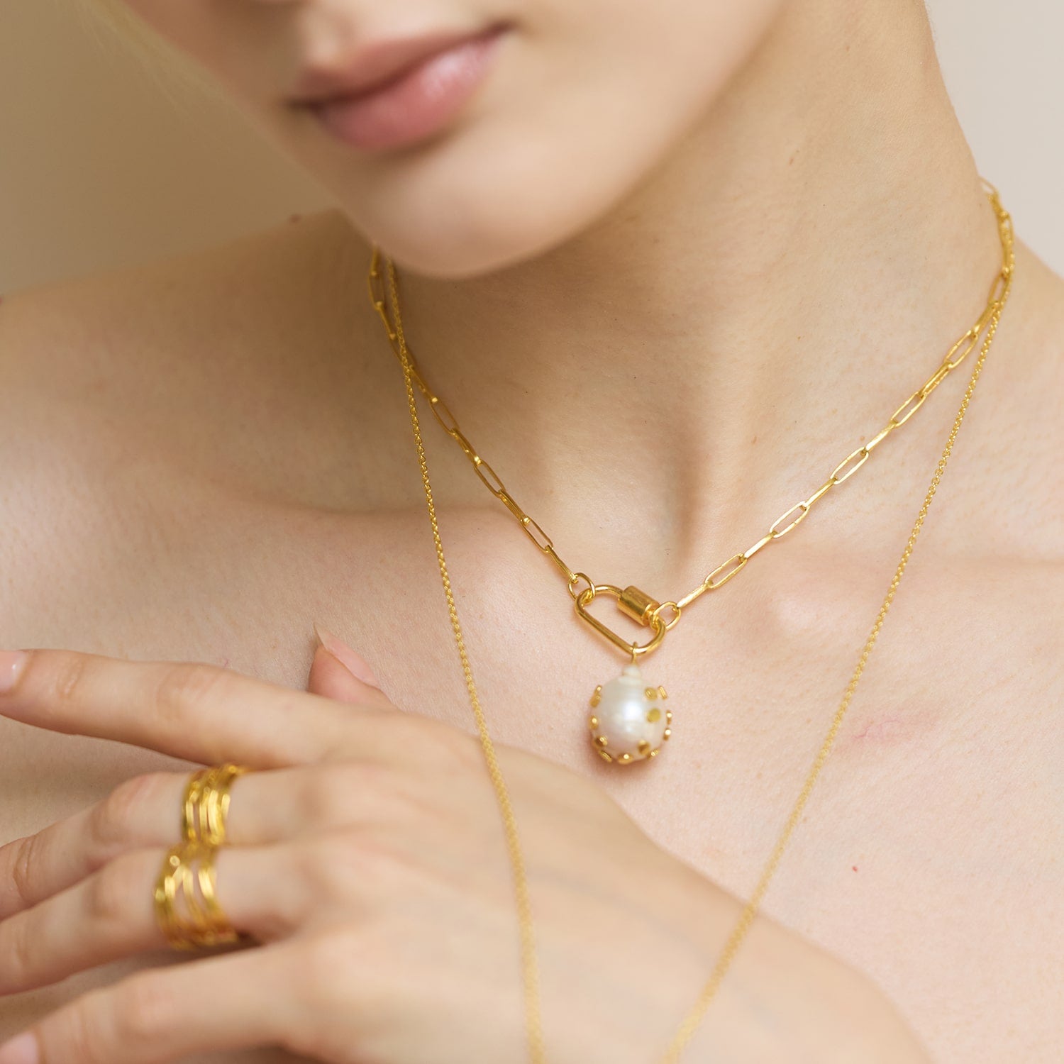 Our Daphne Gold Paperclip Chain Necklace With Barnacle Pendant is an absolute must-have. This chain necklace has a lock that you can open to add a charm to the existing vintage pearl adorned with gold chips.
